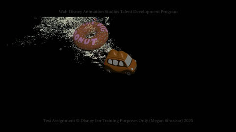 This energetic car chase was given as a canvas for environmental effects. Starting with only the camera, a plain Zootopia themed environment, and car animations, I was tasked to develop new surroundings for the vehicle in order to heighten the interest, stakes, and entertainment of the shot. Utilizing the MPM solver, I created a snowy wonderland, causing the cars to kick up snow, leave slushy tracks in their wake, and be at risk from sliding out at any moment, (may a giant pink donut happen to come crashing into the road from a town over). I wanted to practice matching up to a leading shot, so I took inspiration from the donut sequence in Zootopia to lead into the unexpected twist within my shot.
